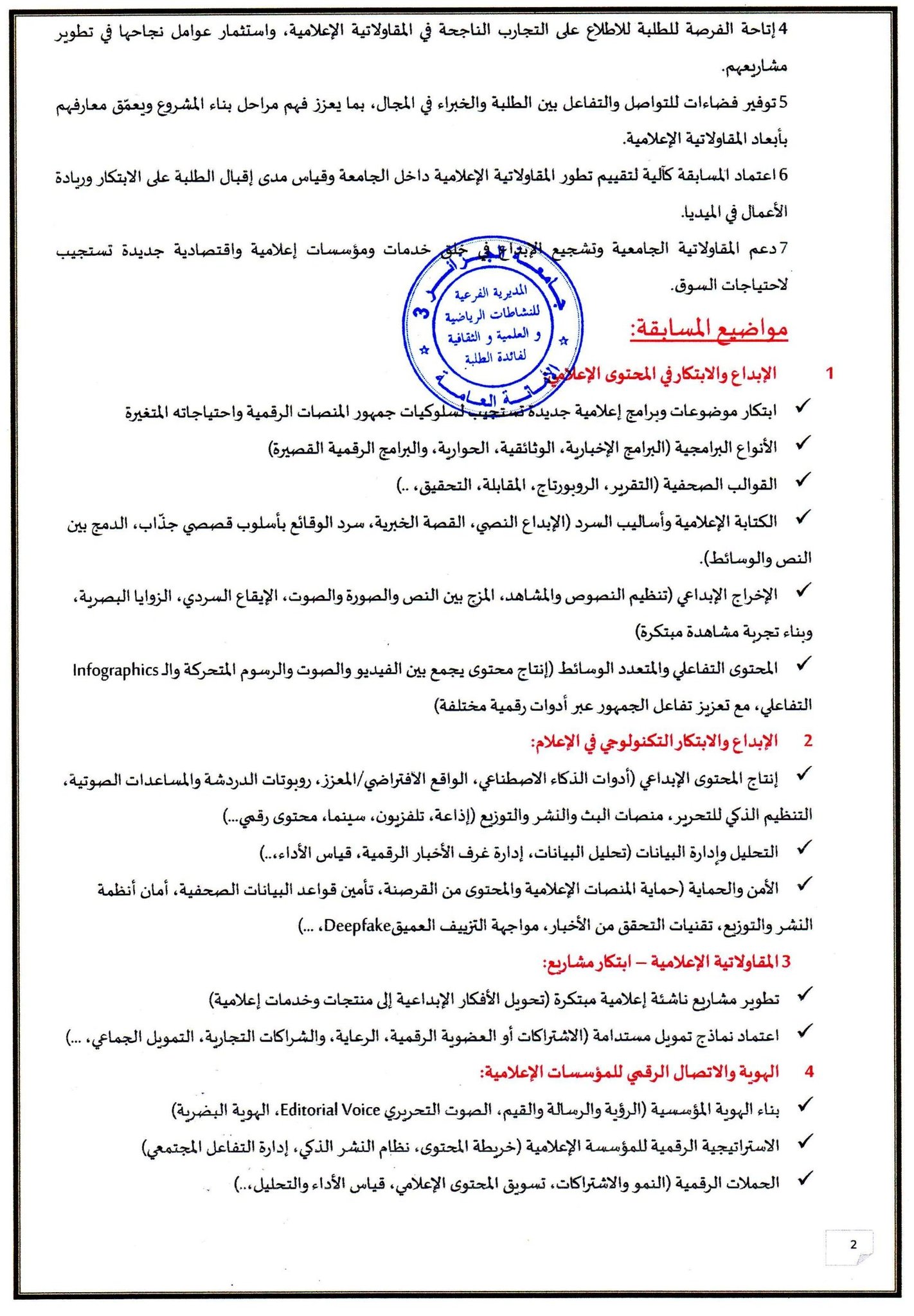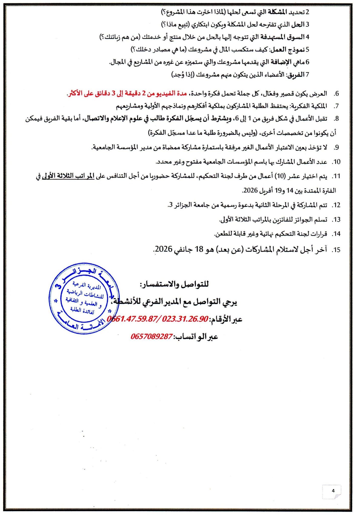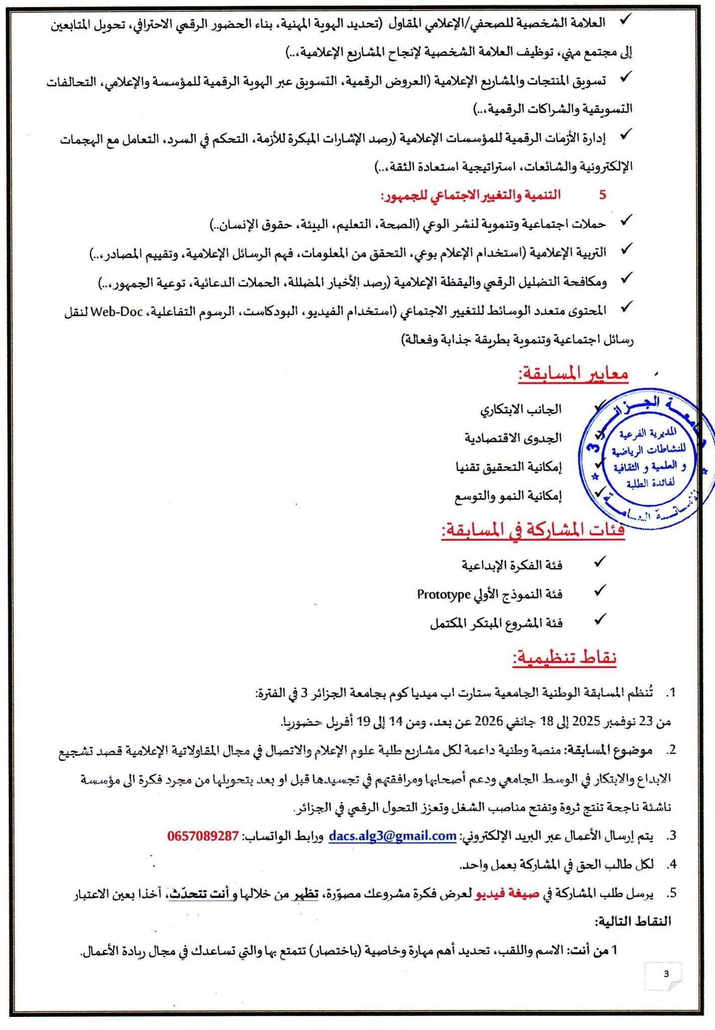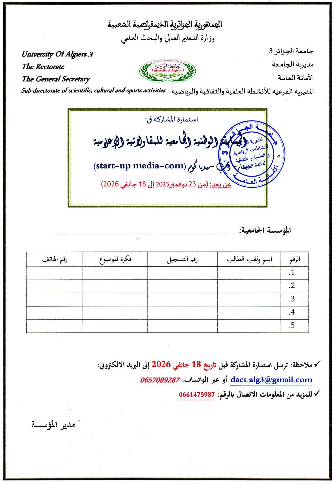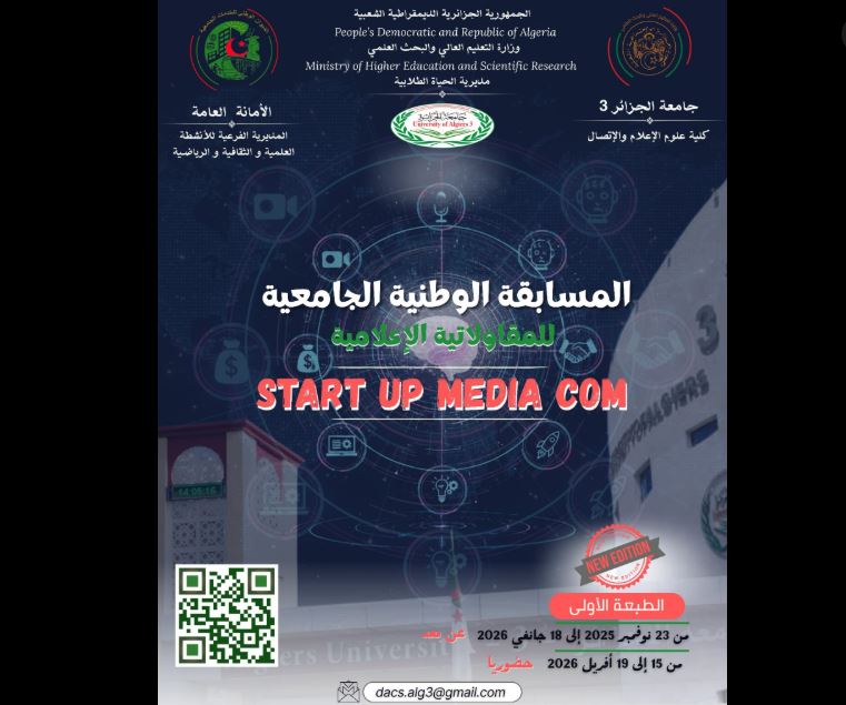 تجسيدا للبرنامج السنوي (2025-2026)، المتعلق بالأنشطة العلمية الثقافية والرياضية، الذي سطرته مديرية الحياة الطلابية بالتنسيق مع الديوان الوطني للخدمات الجامعية، يشرفني إعلامكم بتنظيم المسابقةالوطنية الجامعية للمقاولاتية الإعلامية START UP MEDIA COM التي ستنظمها جامعة براهيم سلطان شيبوط الجزائر03،والتي تجرى على مرحلتين