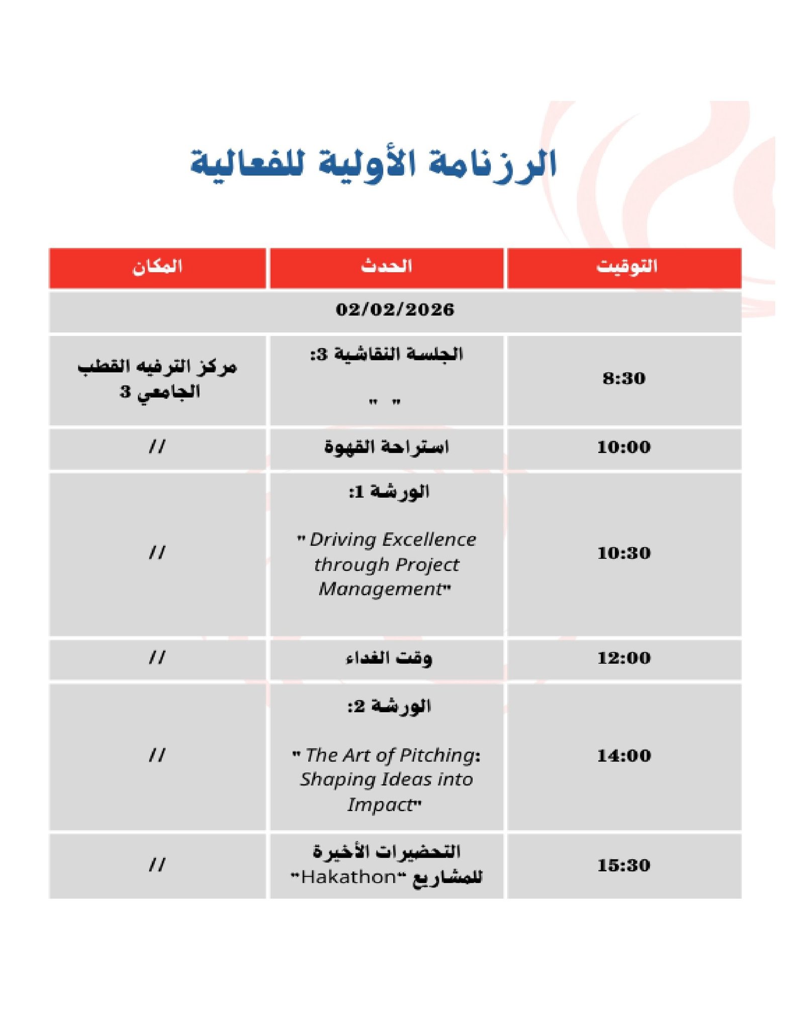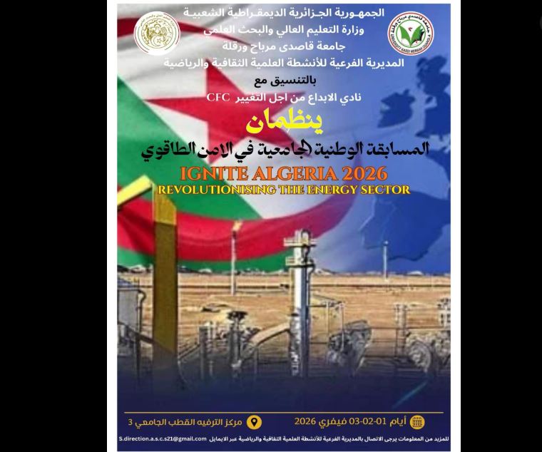 تجسيدا للبرنامج السنوي (2025-2026)، المتعلق بالأنشطة العلمية والثقافية والرياضية، الذي سطرته مديرية الحياة الطلابية بالتنسيق مع الديوان الوطني للخدمات الجامعية، يشرفني إعلامكم بتنظيم المسابقة الوطنية الجامعية في الأمن الطاقوي IGENTTE REVOLUTIONISING THE ENERGY SECTOR ، ALGERIA 2026 والتي تنظمها المديرية الفرعية للأنشطة العلمية الثقافية والرياضية بالتنسيق مع نادي الإبداع من أجل التغييرCF تحت إشراف جامعة قاصدي مرباح ورقلة، وذلك في الفترة الممتدة من01 إلى 03 فيفري 2026، بمركز الترفيه القطب الجامعي 03.