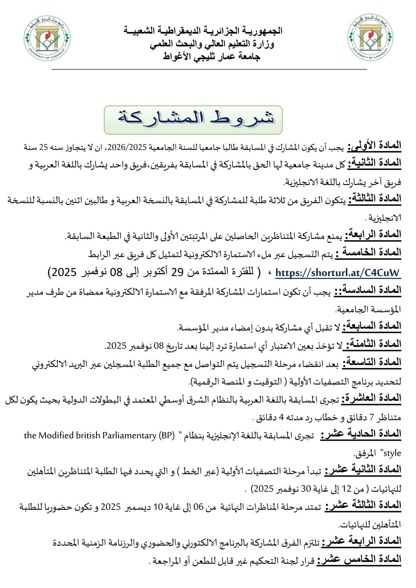فعلى الطلبة الراغبين في المشاركة في هذه المسابقة المزمع تنظيمها بجامعة الاغواط التسجيل على مستوى المديرية الفرعية للنشاطات الكائن مقرها بالإدارة المركزية القديمة الطابق الأول